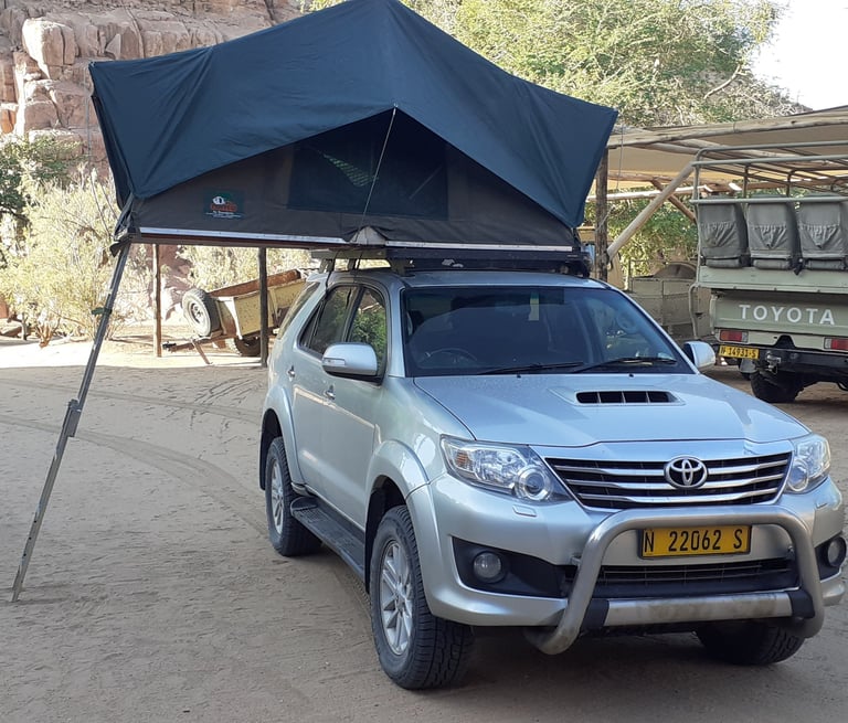 Hilux GD-6 2.4/2.8: Reliable 4x4 perfect for self-drive adventures across southern Africa. It is also available with aluminium canopy, one or two roof-top tents for 1-5 clients and full camping gear. A third on-ground Canvas Tent can be added for free. E.g if 8 people book 2 cars, you sleep 2 (4 rooftop tents), then if there are lone sleeper, you get an additonal ground tent that can accomodate 3 people, with steady air matresses.